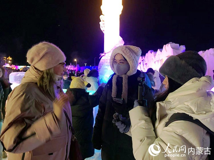 第二十二届中俄蒙国际冰雪节现场,人民日报记者、人民网记者采访俄罗斯游客。实习生 牛佳摄