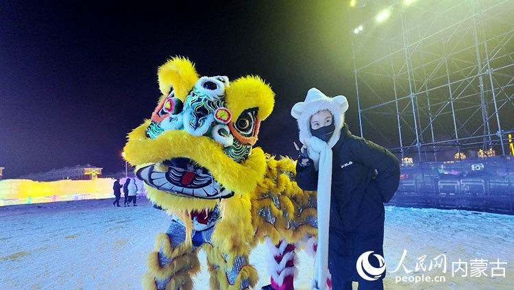 冰雪节现场的游客和舞狮合影。人民网记者 张力洋摄
