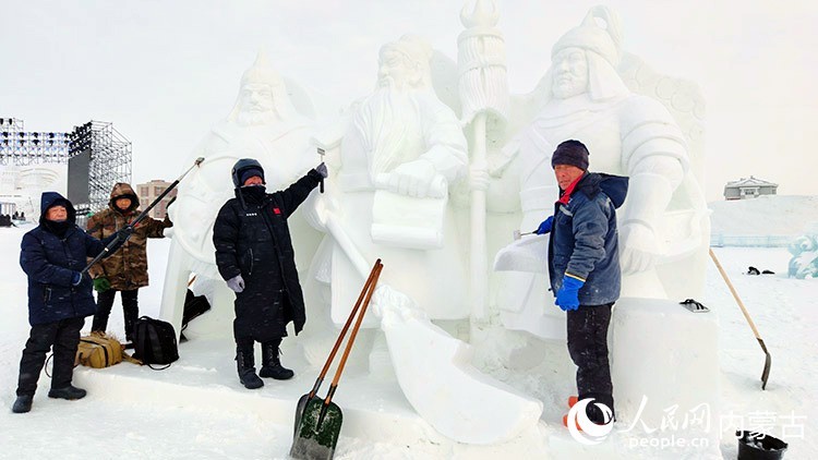 为冰雪主题乐园雕刻雪雕的贾师傅团队,向记者展示完工作品。人民网记者 张力洋摄